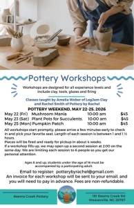 Reems Creek Pottery is offering a series of pottery experiences / workshops over the Memorial Day weekend. Come join the fun and make one of the items — decorative mushrooms, succulent plant pot, or a pumpkin patch. Or sign up for all three sessions.
